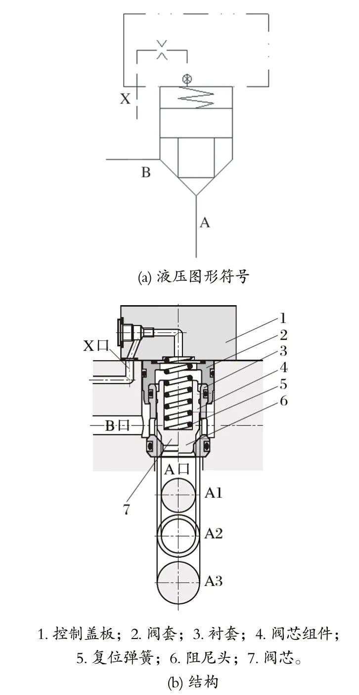 液動換向閥中使用的二通插裝閥如圖4 所示,其主要由插裝組件和控制蓋板組成。二通插裝閥依靠壓力進行工作。通過設計臺階,使二通插裝閥的面積比αA=A1∶A3=1∶2。圖4 中,A 腔中的面積 A1 和A2 以開口方向起作用,面積 A3 和彈簧以閉合方向起作用。開口和閉合方向的力,合成后所產生的有效力的方向決定了二通插裝閥的閥芯位置。當控制油路 X供油壓力zui 高時,面積 A3 受壓,A 腔和 B 腔的壓力油都不能打開閥芯組件,閥芯組件保持關閉,A 腔和B 腔不相通,實現無泄漏封閉;當控制油路 X 與油箱相通時,閥芯組件可以由 A 腔或 B 腔的壓力油打開,壓力油可以從 A 流向 B 或從 B 流向 A,此時,二通插裝閥就具有二位二通方向控制閥功能。