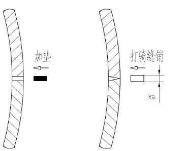 ①重 點檢查兩半卷筒的接合面部位是否出現(xiàn)縫隙。如果縫隙沿筒殼內(nèi)外均勻,則可以從外側(cè)向縫隙填補薄鋼板,并將其固定牢靠;如果縫隙沿筒殼內(nèi)外不均勻,一般是外側(cè)頂緊,造成貼緊的假象。可以從外側(cè)在接合縫部位打騎縫銷并可靠固定,將縫隙處撐緊。