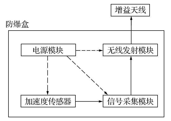 基于振動(dòng)波周期法研制的礦用罐道繩張力檢測裝置如圖3 所示。無線測量儀的原理框圖如圖4 所示。無線測量儀外部設(shè)有防爆外殼,將電源模塊、加速度傳感器、無線發(fā)射模塊、信號(hào)采集模塊等單元密封在內(nèi)。