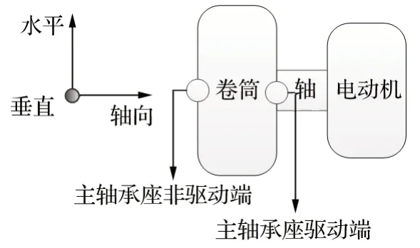 在提升機正常運行下,利用測振儀器對電動機和滾筒的連接主軸承進行振動檢測,經過儀器自帶的軟件進行頻譜分析后得到振動頻譜圖,再與軸承的故障頻率進行比對,從而判斷頻譜中是否存在軸承的故障頻率,進而確定主軸承是否存在故障。主軸承振動測試測點及方向如圖 1 所示。