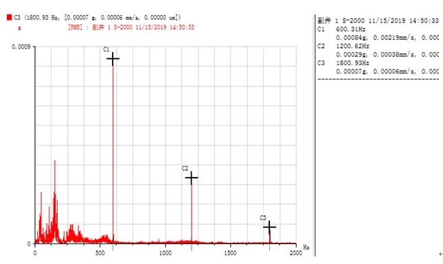 由圖 7、8 可知,振動的主頻率中沒有軸承故障特征頻率,表明軸承運行狀態良好,未出現故障。但是在水平和垂直方向的頻譜圖中,都發現 600 Hz 頻率及其倍頻成分,且該頻率成分的幅值zui高,其對應的是 2 倍的 SCR (全波整流可控硅故障特征頻率)。在頻譜圖中出現此頻率,說明電控系統出現故障,導致提升機運行速度不穩,與前面測試的速度圖可以相互印證。