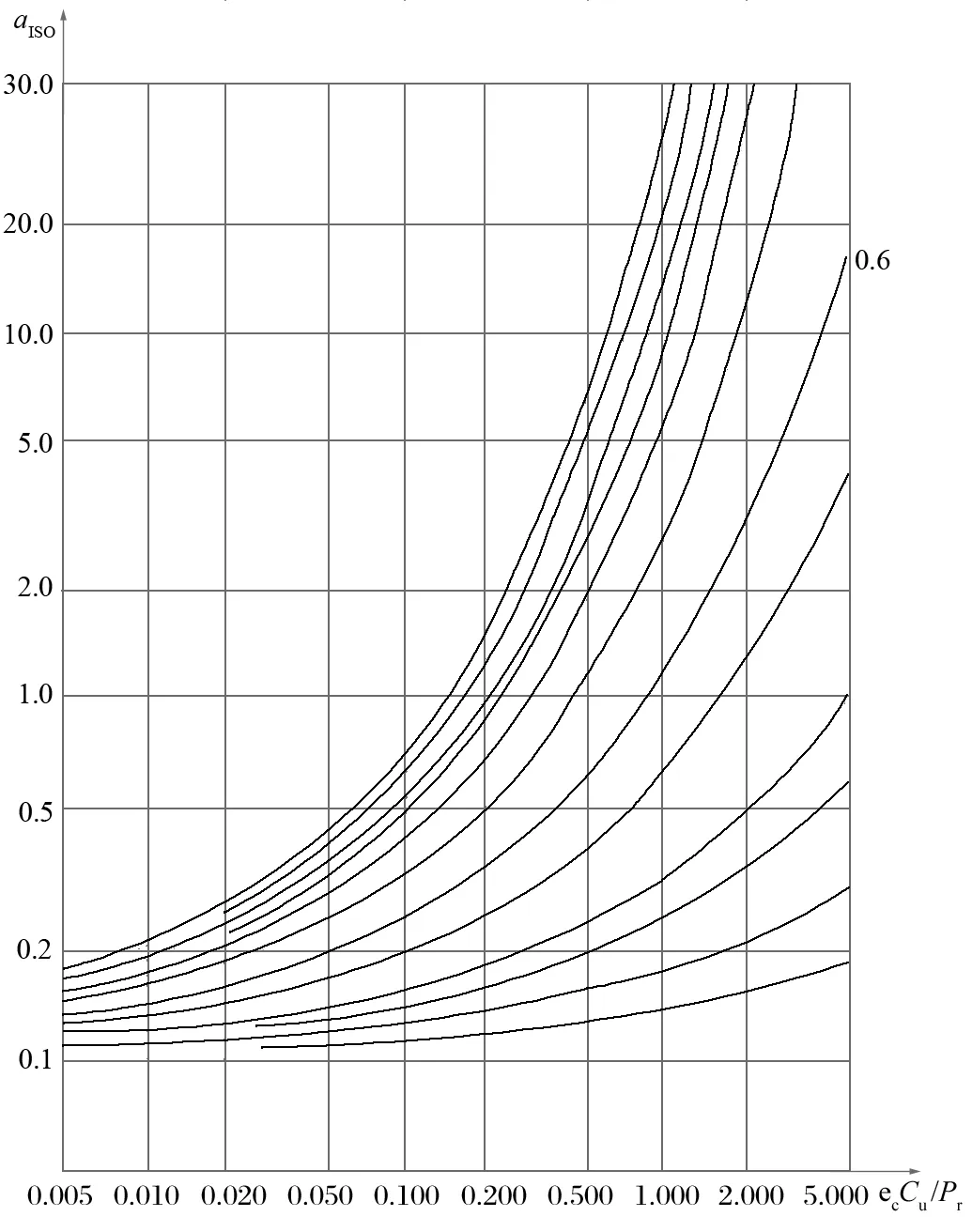 壽命修正系數(shù) αISO 的確定與污染系數(shù)、油脂黏度、軸承溫度、軸承轉(zhuǎn)速、軸承型號、軸承疲勞ji限載荷 Cu 等有關(guān)。針對提升機工況,一般要求軸承溫升不大于 20 ℃,zui高溫度不大于 65 ℃,軸承溫度一般在 20~ 65 ℃ 范圍內(nèi)。現(xiàn)場測量該軸承溫度為 50 ℃。提升機軸承一般采用脂潤滑,多選用 2 號鋰基脂。根據(jù)軸承密封形式、提升工作環(huán)境及油脂更換情況,提升機軸承污染系數(shù) ec 取 0.6~ 0.4。以 JKM-4.5×6PⅢ多繩摩擦式提升機傳動側(cè)軸承為例,軸承型號為240/1060BK30.MB,軸承內(nèi)徑為 1 060 mm,外徑為1 500 mm,軸承寬度為 438 mm,轉(zhuǎn)速為 51 r/min,軸承疲勞ji限載荷 Cu=2 450 kN。