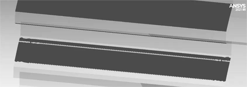在 SolidWorks 中對(duì)同步齒輪進(jìn)行建模并調(diào)整,確保同步齒輪不會(huì)出現(xiàn)干涉。為了提高仿真精度和數(shù)據(jù)的可靠性,對(duì)靜強(qiáng)度仿真過(guò)程中參與嚙合的幾對(duì)輪齒表面網(wǎng)格化。齒面網(wǎng)格細(xì)化模型如圖5所示。