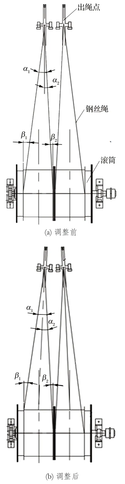 圖4 調(diào)整前后鋼絲繩內(nèi)外偏角對(duì)比示意