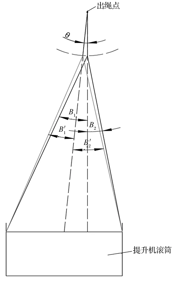 調(diào)整天輪和鋼絲繩內(nèi)外偏角的原則,需保證內(nèi)外偏角值滿足《金屬非金屬礦山安全規(guī)程》規(guī)定,同時(shí)還要確保出繩點(diǎn)位置不改變,即出繩點(diǎn)應(yīng)維持在罐籠中 心位置的正上方,保證提升容器穩(wěn)定,如圖 2 所示。θ 為 1 號(hào)天輪和基座整體旋轉(zhuǎn)的角度,以出繩點(diǎn)為原點(diǎn)順時(shí)針轉(zhuǎn)動(dòng);B1 和 B2 為調(diào)整之前的內(nèi)外偏角,圖片′為調(diào)整之后的內(nèi)外偏角,2 號(hào)天輪和 1號(hào)天輪的調(diào)整方式一致,僅旋轉(zhuǎn)方向?yàn)槟鏁r(shí)針?lè)较颉?