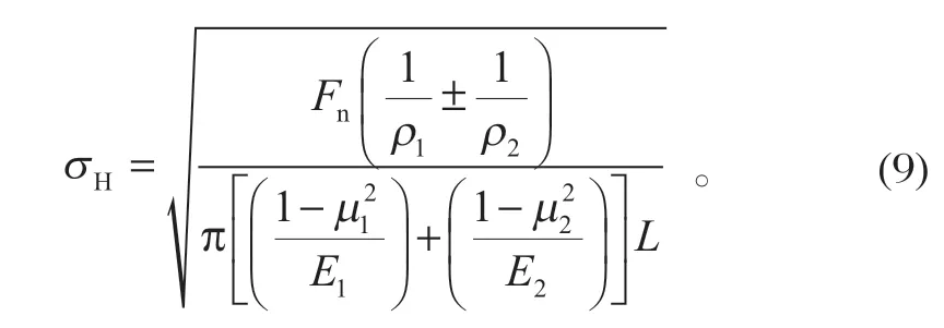 3.2 理論計(jì)算Hertz 接觸理論是研究疲勞、摩擦及任何有接觸體相互作用的基本理論。在齒輪嚙合過程中,將齒輪的接觸問題等效為兩圓柱面的接觸問題。赫茲接觸應(yīng)力