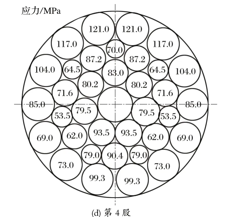 將鋼絲繩纏繞在直徑為 2 m 的天輪上,在實(shí)際求解時(shí),將計(jì)算內(nèi)部接觸點(diǎn)位置作為求解的計(jì)算點(diǎn)。此時(shí),選取位于摩擦天輪繩槽上下兩側(cè)和右側(cè)的部分繩股作為研究對(duì)象,并且沿著順時(shí)針方向進(jìn)行標(biāo)記,標(biāo)記出第 1、2、3、4 股。仿真分析得到的鋼絲繩應(yīng)力分布如圖4 所示。