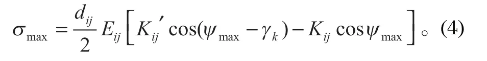 式中:dij 為第 j 股中的第 i 個(gè)鋼絲繩只有一根鋼絲繩時(shí)的直徑值,mm;Eij 為第 j 個(gè)單根鋼絲繩的彈性模量;Kij 為在第 j 股中的第 i 個(gè)鋼絲繩層在進(jìn)行變形前后的曲率,(°)/mm。
