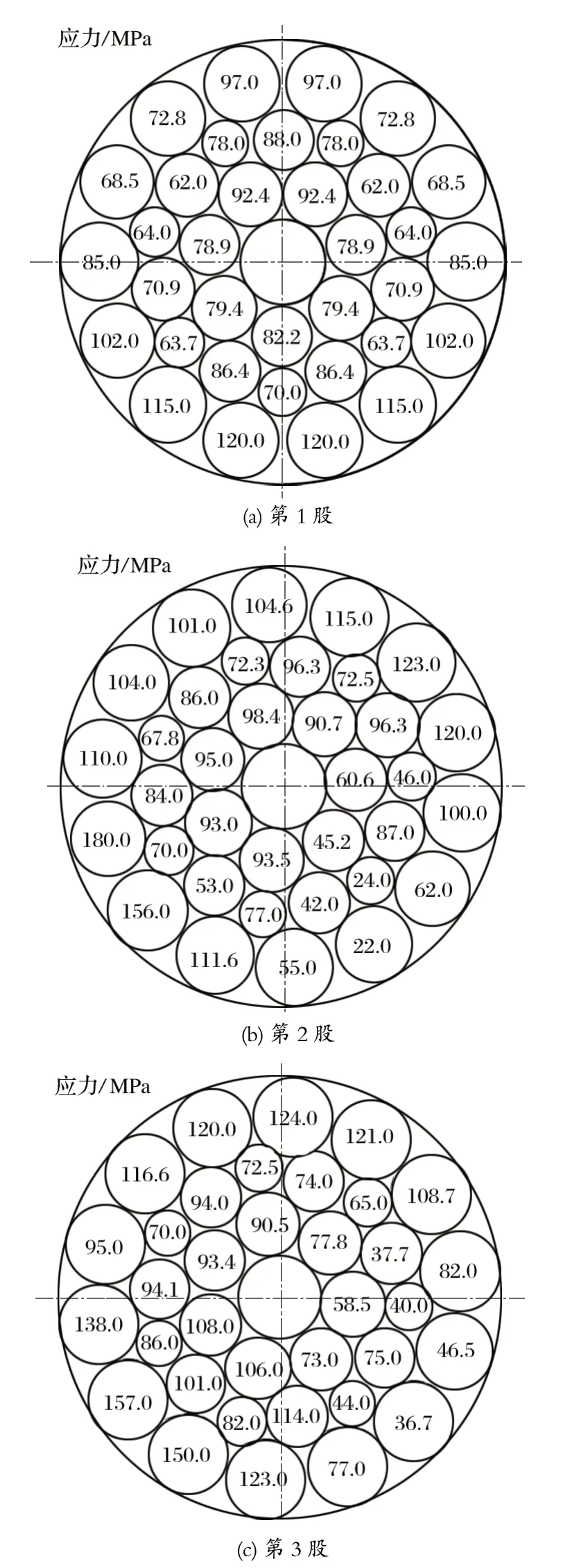 由圖4 可知,鋼絲繩第 1 至第 4 股內(nèi)第 1 層至第3 層鋼絲的總體應(yīng)力為 94.08、90.08、71.20 和 117.80 MPa。從圖中可以看出,鋼絲繩芯中 心軸的對(duì)稱軸位置處,第 1 股和第 4 股的鋼絲繩應(yīng)力是沿著左右方向?qū)ΨQ分布的;右同向捻和右交互捻鋼絲繩靠近繩芯的位置彎曲應(yīng)力較大。為了研究提升鋼絲繩的應(yīng)力分布及分布規(guī)律,采用有限元分析法建立鋼絲繩物理模型并進(jìn)行數(shù)值模擬,可以直觀得到鋼絲繩內(nèi)部以及繩股之間的應(yīng)力分布。